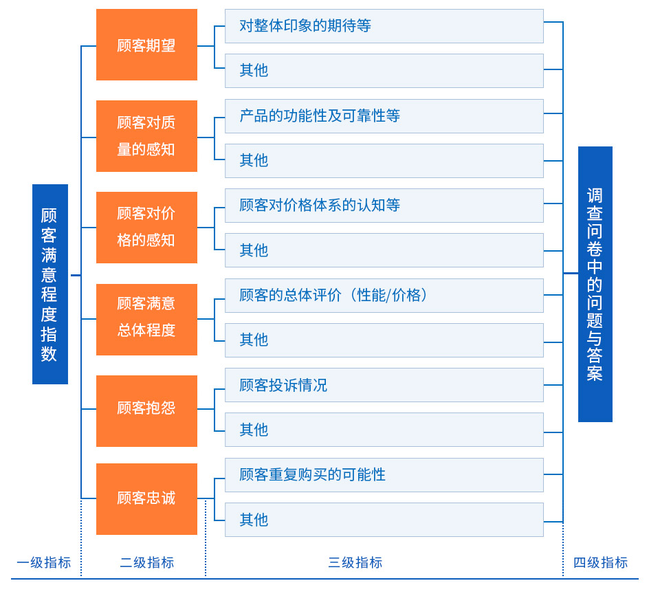滿意度研究指標(biāo)的四個(gè)層次如下圖表示。